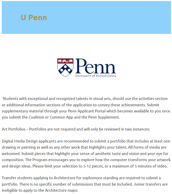 Some schools that accept art portfolios include Harvard, Yale, Princeton, Columbia, Dartmouth, Brown, MIT, Stanford, and the University of Chicago — but requirements vary by institution.
